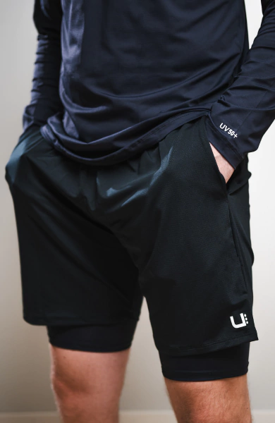 Short duplo: Para maior liberdade de movimento e segurança ao mesmo tempo.