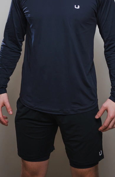 O short de cima, possui uma modelagem mais solta, com elástico firme no cós, proporcionando conforto e ajuste perfeito. Já o short de baixo, é mais justo, oferecendo segurança extra para os movimentos, sem perder a flexibilidade.