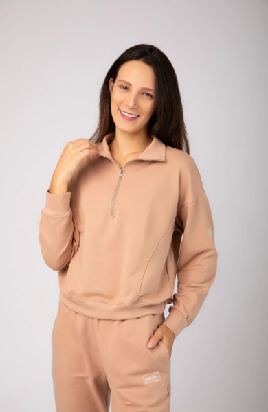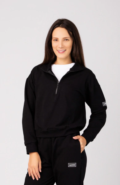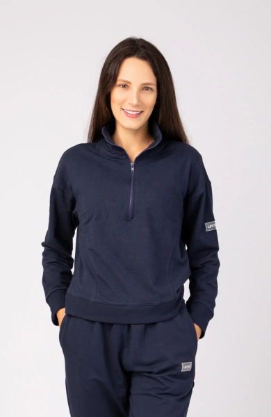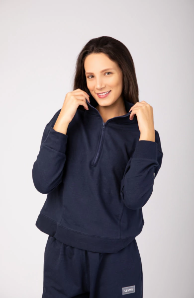 Com gola média e meio zíper, o modelo permite ajuste térmico e um visual esportivo e moderno. Os recortes estratégicos afinam a cintura e valorizam a silhueta, enquanto a manga levemente caída garante um caimento despojado e confortável. Os punhos e barra em ribana finalizam a peça com elegância e garantem melhor ajuste ao corpo.